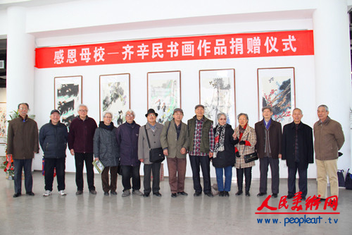 齊辛民先生在儀式上講話。齊辛民先生在講話中表示,此次回到母校非常激動和高興,本次展覽和捐贈作品活動得到了學(xué)校領(lǐng)導(dǎo)、老師和相關(guān)部門的關(guān)心、支持和幫助,他對此表示衷心感謝。齊辛民先生說,人的一生中在學(xué)校受教育的時期是非常關(guān)鍵的,一個人走向社會取得成功與其在學(xué)校受到的教育是分不開的。他講到,我們通常稱自己就學(xué)的學(xué)校為“母?!?nbsp;,就說明學(xué)校在一個人心中的位置。母親是至高無上的愛,“老師如父母,同學(xué)如兄弟,”這句話很能說明學(xué)生與老師的密切關(guān)系,我們永遠(yuǎn)不會忘記母校和老師對我們的恩情,母校和老師永遠(yuǎn)值得我們尊敬。作為一個畢業(yè)50多年、年近80歲的老學(xué)生,回首求學(xué)的艱苦歲月,老師勤勤懇懇的教,學(xué)生非常努力的學(xué),是值得回憶的時期。齊辛民先生表示,這次回母校舉辦作品展和捐贈作品,就是懷著感恩之情,也是向母校交了一次“作業(yè)”,希望得到領(lǐng)導(dǎo)、老師的教導(dǎo)、批評和指正。