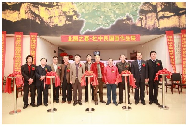 2013年4月13日上午,“北國之春?杜中良國畫作品展”在河北石家莊市博物館拉開帷幕,中共中央辦公廳王關(guān)山,原山東省委辦公廳主任任培金,原河北省軍區(qū)政委汪潮海,紀(jì)曉嵐紀(jì)念館館長李新永,河北省委宣傳部部長秘書吳中華,中國孔子國畫院名譽(yù)院長袁軍,河北瀟湘源酒店總經(jīng)理周建軍,石家莊護(hù)盾建筑裝飾工程有限公司總經(jīng)理王總,河北神興建筑工程有限公司董事長王金龍,河北畫院黨總書記李增民,河北美術(shù)家協(xié)會(huì)學(xué)術(shù)委員會(huì)主任李維世,石家莊公安局新華分局副局長曹文平,河北英大投資股份有限公司董事長李志強(qiáng),北京圣金源幕墻裝飾工程有限公司董事長李志剛,河北英大投資股份有限公司總經(jīng)理陳利鵬,江西國新建筑工程有限公司董事長楊海財(cái),錦繡綠美商貿(mào)有限公司董事長劉德清,北京陽光華瀚測(cè)繪有限公司董事長桂晨東,北京永利信豐房地產(chǎn)開發(fā)有限公司董事王春生,河北山水畫研究會(huì)副會(huì)長孟兵等,以及來自北京、山東、河北等地的企業(yè)家、藝術(shù)家等二百余嘉賓參加開幕式并參觀展覽。