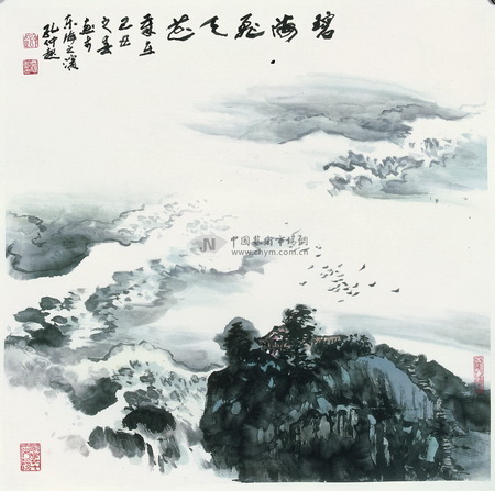“80后”的孔仲起,自然要再畫一筆錢江潮。去年冬天,他把這“八零后第一潮”完成了。潮水卷著云氣翻騰了整張畫面,橘紅色的六和塔矗立中間,一行飛鳥掠過水天交界處,宛如仙境。