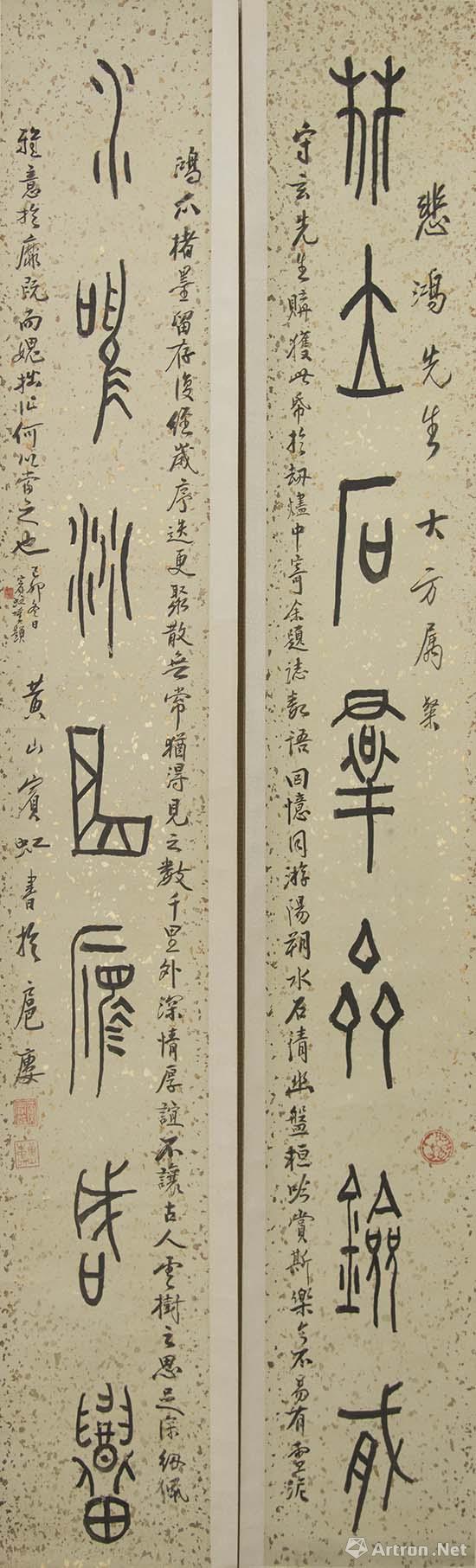 說明 :吳昌碩(1844-1927),浙江安吉人,初名俊,又名俊卿,字昌碩等。他集“詩、書、畫、印”于一身,融金石書畫為一爐,被譽為“石鼓篆書第一人”、“文人畫最后的高峰”。此聯(lián)集自《石鼓文》,贈沈石友先生。