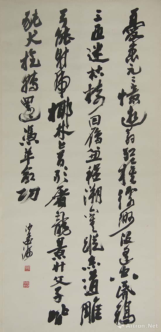 說明:沙孟海(1900-1992),浙江鄞縣(今寧波市鄞州區(qū))人。原名文瀚,后改文若,字孟海,號石荒、沙村。書由《圣教序》入,自習《嶧山碑》。青年時醉心北碑,繼而悉心臨摹歷代碑帖,諸體兼擅。尤擅行草,善用北碑方筆,以側鋒取勢,形成雄渾恣肆的書風。