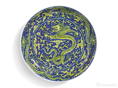 清康熙 青花地黃彩趕珠云龍紋盤 《大清康熙年製》款 20萬美元 10-20萬美元