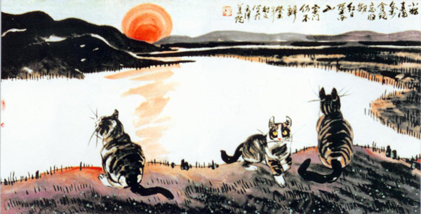 楊樹文先生畫動(dòng)物,筆簡(jiǎn)而形不曲,雖是寫意,但仍保持形象逼肖。他筆下的貓或蹲或伏,或立或行,或凝望,或觀望,個(gè)個(gè)形象逼真可愛,如同再造,大有呼之欲出的感覺,使人觀之不厭?!短詺獾男∝垺房煞Q得上是一副匠心獨(dú)運(yùn)的佳作。許多人表現(xiàn)貓的淘氣都首先考慮大動(dòng)作,諸如玩線團(tuán)、撈金魚或給人添亂的一些動(dòng)作情節(jié)。而他卻采用了靜態(tài)的表現(xiàn)形式,他把兩三只稚態(tài)可掬、東張西望和迷茫不知所向的小貓,一字排開的安置在一個(gè)空曠的沙灘上,它們眼前是一片一望無際的葦?shù)?。天邊半輪下沉的紅日。窄狹的天空位置是一排小詩橫題,把天與葦?shù)砘鞛橐惑w,更增加了葦?shù)淼倪|闊和空曠感,使人不能不為這幾只身臨困境的小貓擔(dān)心。讀過款中小詩,你會(huì)更覺得此畫的親切好玩。詩云:“小貓真淘氣,貪玩忘歸期,紅日墜西山,家門不知處?!庇袀€(gè)朋友對(duì)我講:“我家自從掛出了楊教授的《淘氣的小貓》,孩子就很少向外亂跑了?!?