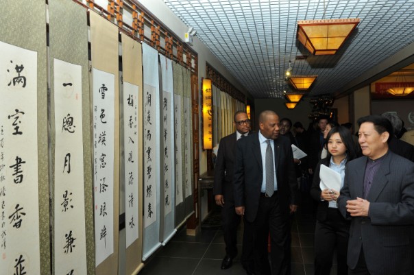 中華硯文化發(fā)展聯(lián)合會(huì)會(huì)長(zhǎng)劉紅軍中將(右)與中外嘉賓一同參觀展覽