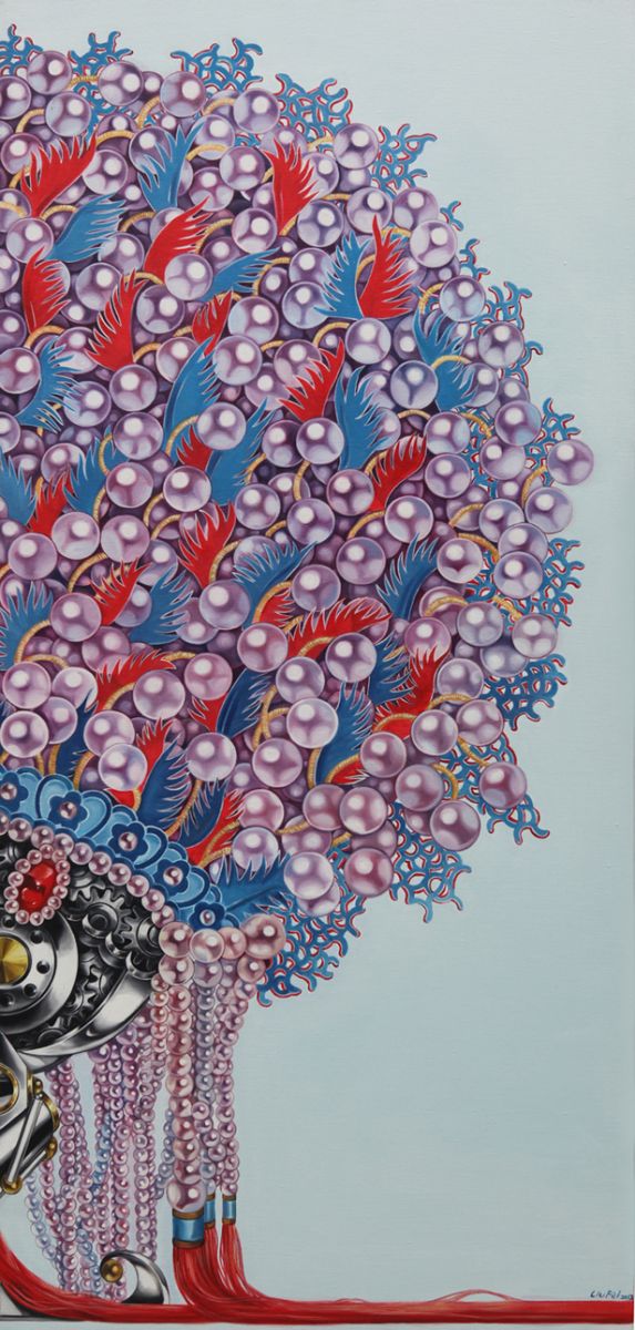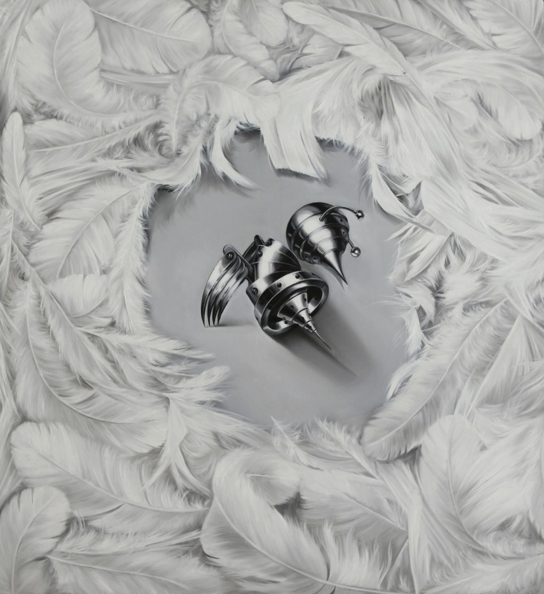 一個(gè)出生于80年代的女孩,經(jīng)歷了中國(guó)最高速發(fā)展的社會(huì)當(dāng)下,她非常專注地通過(guò)個(gè)人對(duì)機(jī)器的經(jīng)驗(yàn),構(gòu)筑了一個(gè)迥然獨(dú)存的有機(jī)體和機(jī)器體在存在形態(tài)上互構(gòu)對(duì)話的世界——在這個(gè)世界里,從兒時(shí)工廠所見(jiàn)的大型設(shè)備機(jī)器,到家家戶戶擁有和生活相關(guān)的可使用機(jī)器,漸漸的,她發(fā)現(xiàn)機(jī)器對(duì)于自己的生活到底有些怎樣的影響呢?它們是否就真正只是一個(gè)簡(jiǎn)單的帶有功能的“機(jī)器”呢?如此冰冷、純粹、靈活、直接的物體,在藝術(shù)家看來(lái),它們擁有自己的生命,這并非是一種“無(wú)生命”的工具,在金屬外殼的包裹下,它們并非要拒人于千里之外,這僅僅是人類(lèi)一廂情愿為它們創(chuàng)作的面孔,它們無(wú)權(quán)選擇,又有多少人會(huì)留意到它們所帶來(lái)改變我們生活的科技進(jìn)步呢?藝術(shù)家把這些被自己“設(shè)計(jì)”的擬人化機(jī)器,空靈地放置在一切與自己生活相關(guān)的事物當(dāng)中,從最早“冷金屬”的單一表現(xiàn),到“靜物金屬”的相互融合,再到更真實(shí)的“動(dòng)物金屬”系列中去設(shè)計(jì)最強(qiáng)大生物生命力的震撼與金屬小人們之間的對(duì)話。她刻畫(huà)的機(jī)器人是虛擬的,是有生命性的,藝術(shù)家也“設(shè)計(jì)”了一些反應(yīng)自己內(nèi)心寫(xiě)照的人物;而其他一些作品中,畫(huà)面里無(wú)論動(dòng)物、京劇和植物,都刻畫(huà)到與真實(shí)照片接近,這里關(guān)鍵的概念也許就是“存在性”、“同時(shí)性”和“場(chǎng)景性”。這種種創(chuàng)作的手法和藝術(shù)家的個(gè)人眼光,以及其作品所構(gòu)成的充滿解放意味的世界,體現(xiàn)出藝術(shù)作品中虛-實(shí)的空間概念和時(shí)間概念,它們一把抓住觀眾,從而引起共鳴。