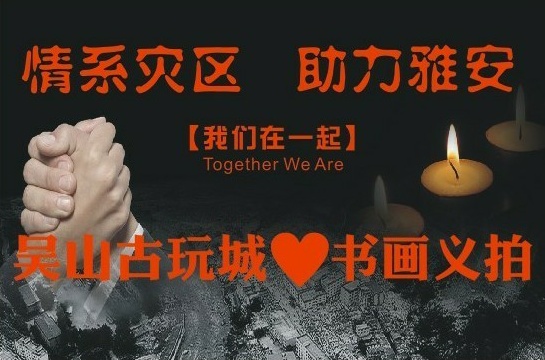 2013年4月20日上午8時(shí)02分在四川省雅安市蘆山縣(北緯30.3度,東經(jīng)103.0度)發(fā)生7.0級(jí)地震,震源深度13公里,造成了極大的傷亡和損失。為了盡快傳遞一份愛心,盡最大努力支援災(zāi)區(qū)的同胞,杭州慈善總會(huì)、杭州吳山古玩城與華夏收藏網(wǎng)聯(lián)合省市公眾媒體和知名書畫藝人和社會(huì)各界愛心人士,將為雅安地震災(zāi)區(qū)組織專場愛心書畫網(wǎng)拍義賣活動(dòng)。