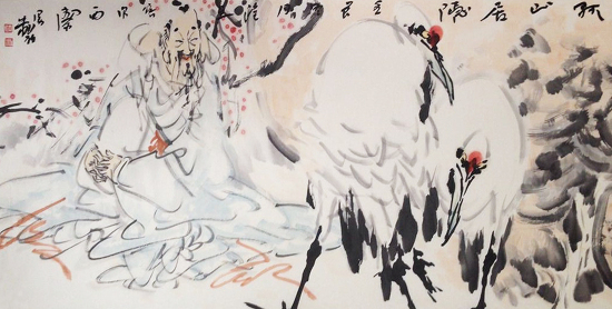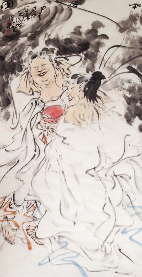 他以創(chuàng)造性的筆墨,勾勒出藍天下,白云深處一幅幅世外桃源的景象,意寫著當代思辨精神,或諷辣、或隱喻、或空靈飄逸、或悲懷傷痛、或暢朗大氣的人物一個個向我們走來,似乎有師承的王子武、吳山明的書卷文人之氣,但更多是他作品深深的憂患意識,對中國當代水墨創(chuàng)造性的技法運用和人文表達情境的拓展。