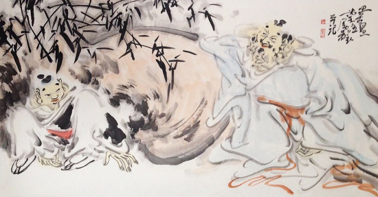劉西潔作品總體形式感特征鮮明,非一般意義上的傳統(tǒng)中國畫的重復沿革。在西方藝術充斥的時代,劉西潔以傳統(tǒng)文化精神為軸心,在汲取傳統(tǒng)筆墨精髓的基礎上,驅動多元觸角,廣采博取,嘗試中西繪畫因素的混響與重組。形成了獨具一格的審美情趣,如西方現(xiàn)代藝術的形式構成、夸張變形、西畫中的斑駁陸離的光影、透視等等,都能在他的畫中體現(xiàn)。劉西潔的藝術源頭既有傳統(tǒng)的又有西方的,更是生活的,他的畫中不乏表現(xiàn)當下蕓蕓眾生生活狀態(tài)和內心世界的題材,帶有濃厚的生活氣息,深入表現(xiàn)了人們靈魂深處的寄語,畫面簡約而單純,極具親和力。線條揮寫自由,富有節(jié)奏與韻律,形與線,若即若離,相得益彰,線因形而生韻,形因線而生趣。取黃鉞《二十四畫品》第十五品“性靈”有曰:“耳目既飫,心手有喜。天倪所動,妙不能已。自本自根,亦經亦史?!眮硇稳輨⑽鳚嵉漠嬶L頗為合適。