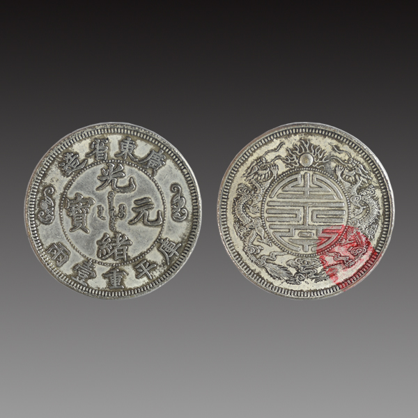 此藏品現(xiàn)為豪隆展覽平臺所展示藏品。編號為:ZX160525,直徑:4.4cm,此幣正面以珠圈為界,可分為內(nèi)外兩個部分:珠圈以外,上端為“廣東省造”四字,下方為“庫平重一兩”五字,左右兩側(cè)各鑄一蝙蝠圖案;珠圈以內(nèi),鑄有滿、漢文“光緒元寶”四字。背面也以珠圈為界:珠圈外面,鑄有雙龍圖案;珠圈里面,鑄有一圓形“壽”字。