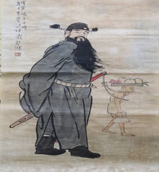 鐘馗在中國傳統(tǒng)文化中是捉鬼的神,其相貌丑陋,卻心地善良,嫉惡如仇,是非分明。人們常掛鐘馗畫以辟邪驅(qū)魔,歷代畫家也多有涉獵鐘馗形象。自鐘馗畫出現(xiàn)以來,鐘馗形象都是面貌丑陋、樣子古怪的,但是徐悲鴻先生筆下的鐘馗明顯以現(xiàn)實(shí)生活的人為原型,比例適度,神態(tài)飽滿,充滿了人情味。