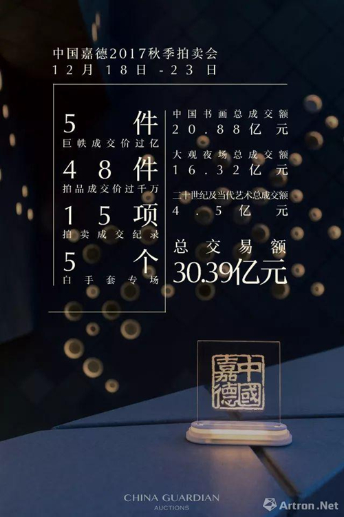 12月23日晚,在王府井大街一號,伴隨著郵品錢幣最后一個專場的最后一聲槌響,中國嘉德2017秋拍的大幕徐徐落下,歷時6天共38個專場的拍賣,以30.39億元的總成交額圓滿落槌。