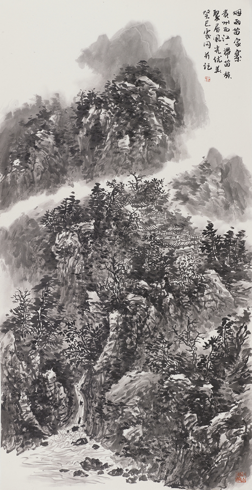 ▌褚震岡《煙雨苗家寨》137 × 70 cm