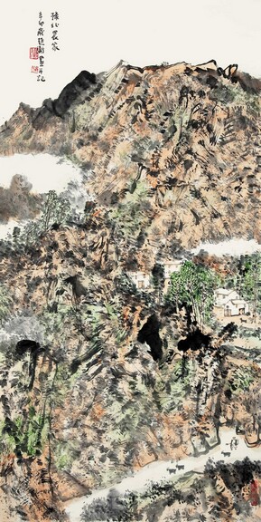 蒼茫孤峻的山石,或泛黃,或泛青,或泛白,或黃綠各色相間,色彩始終在變,隨著季節(jié),隨著心境;山離不開樹,樹在趙衛(wèi)的筆下是很符號(hào)化的,但也是變化多端的,樹令山顯得更有層次,令整個(gè)畫面更富有節(jié)奏感;看似隨意點(diǎn)綴其中的幾棟簡(jiǎn)單農(nóng)舍,帶點(diǎn)神秘,遠(yuǎn)離世俗喧囂,卻是畫家精心布局的棋子,且給讀畫者留下了足夠的想象空間,令人情不自禁地猜測(cè)那里的風(fēng)土人情,那里不為人知的故事;水是離不了的風(fēng)景,或如白練從天而降,或如玉帶蜿蜒曲折,滋潤(rùn)著山石,滋潤(rùn)著樹木,滋潤(rùn)著人心;略顯夸張的人物造型,幾筆勾勒的農(nóng)家動(dòng)物,使得農(nóng)家的野趣和生活化的情景躍然紙上。線條的剛健,皴擦的柔美,彼此獨(dú)立而又不可分割,剛健只有與柔美結(jié)合才能成為陽(yáng),柔美只有在剛健的對(duì)比下才能彰顯其魅力。