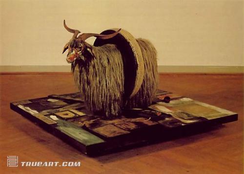 羅伯特·勞森伯格,是美國波普藝術(shù)家的代表人物。他的作品《交織字母》是一只腰上套著一個(gè)汽車輪胎的山羊的人工制品,這里的羊,輪胎有特殊含義,是同性戀的標(biāo)志,反映當(dāng)時(shí)同性戀爭取自身權(quán)益的情況,具有很強(qiáng)的現(xiàn)實(shí)性。