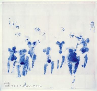 伊夫·克萊因,他用合成樹脂混合藍(lán)色色料而得到的高貴而靜穆的“克萊因藍(lán)”,出現(xiàn)在他的大多數(shù)作品、繪畫和雕塑中,如《藍(lán)色單色畫》、《人體測量術(shù)》,以拖拉涂抹了藍(lán)色顏料的裸女在鋪在地面的畫布上得到痕跡為作品。