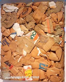 法國雕塑家凱撒,采用擠壓的方式來表達(dá)對消費(fèi)的關(guān)注。將瓦楞紙壓縮在畫框里垂直懸掛形成平面展示。
