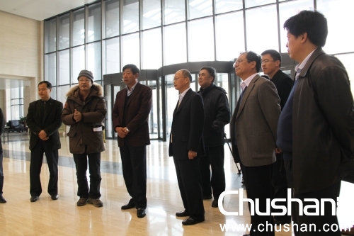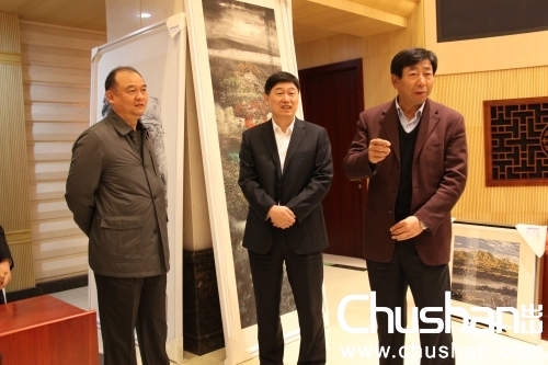 中國鐵建董事長、黨委書記孟鳳朝(右一)、總裁張宗言(中),黨委副書記、紀(jì)委書記、監(jiān)事會主席、大路美協(xié)主席齊曉飛(左一)到場參觀