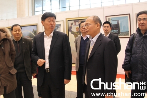 中國鐵建黨委宣傳部部長、《中國鐵道建筑報》社社長、總編、大路美協(xié)常務(wù)副主席錢桂林(右三)陪同中國鐵建董事長、黨委書記孟鳳朝(中)參觀畫展
