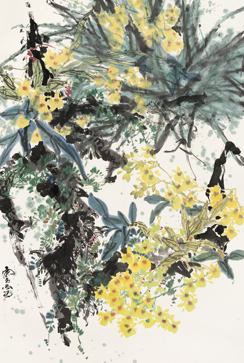 姚舜熙的花鳥畫具有一種反映出當(dāng)代藝術(shù)特質(zhì)的“大花鳥境界”。這種境界的核心是“大”。在藝術(shù)意境上具有當(dāng)代藝術(shù)闊大、明朗、豐富與豪邁的品質(zhì)。他作品中的花鳥形象通常是充滿畫幅的,甚至有漲溢出畫幅有限空間的感覺,由此使得畫面的視野遙遙向無限擴(kuò)展,他所畫的花卉草木飽滿密織,墨色交輝,閃動(dòng)著精神的光彩;他最大的特點(diǎn)是將花鳥畫的造型與廣袤寬闊的山川、大地、天空和空氣疊印在一起,使花鳥真正作為大自然的有機(jī)形體,還原于大自然的懷抱之中。于此可以說,姚舜熙在面對花鳥畫形象之時(shí),投注了對于自然生命深切的關(guān)愛,他描繪的不僅是花鳥的儀態(tài),而是自然造物的生命本質(zhì),他的畫始終洋溢著一股郁郁蔥蔥,生生不息的生命氣象。
