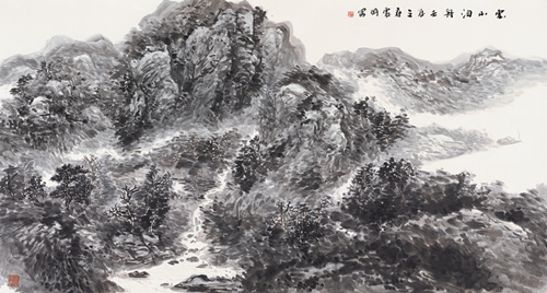 褚震岡云山泊舟(凈土清流畫冊出版原作) 96×178cm