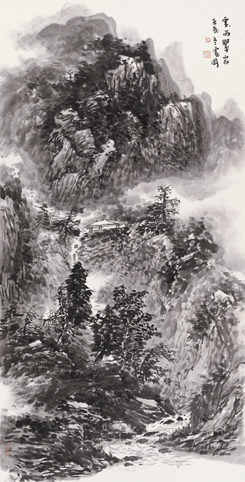 褚震岡 云雨翠巖(凈土清流畫冊出版原作) 137×70cm