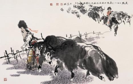 生在牛村認(rèn)牛命,只識(shí)畫牛不吹牛。雨雪風(fēng)霜不知苦,芳草夕陽(yáng)度春秋?!边@首詩(shī)是畫家劉濟(jì)榮對(duì)自己藝術(shù)生涯的總結(jié)。劉濟(jì)榮本以畫人物著稱,但近十幾年來,他畫了大量的牛,從“西藏牦?!碑嫷健翱图腋!?,以至畫界稱他為“嶺南牛王”,而劉濟(jì)榮則在自畫像中稱自己是“牧牛人”。劉濟(jì)榮本是廣東客家人,但他的畫作最為人所津津樂道的就是“牦?!迸c“西藏女”的天作之合。西藏女是柔的,牦牛是剛的,這樣一柔一剛形成風(fēng)骨對(duì)比。他的很多創(chuàng)作都是源于他對(duì)生活的理解。正獲得歷史尊重的藝術(shù)家,總是熱愛生活,關(guān)注生活的。劉濟(jì)榮教授正是這樣的嚴(yán)肅藝術(shù)家和美術(shù)教育家。