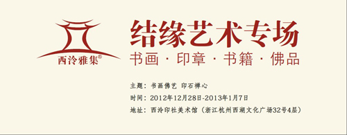 基于傳承,值此歲末年終,由西泠印社美術(shù)館主辦,杭州書畫社承辦的西泠雅集—結(jié)緣藝術(shù)專場將于2012年12月28日至2013年1月7日在西湖文化廣場32號四樓西泠印社美術(shù)館舉行。屆時,書畫、印章、書籍、佛品齊聚亮相,展銷結(jié)合。書畫佛藝,印石禪心,別開生面的文化融合必將給愛好藝術(shù)、結(jié)緣向善的人們帶來心靈的愉悅和物質(zhì)的收獲。