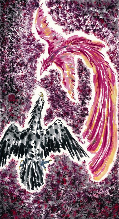 近讀她畫作《元泱之涅》,深感其高昂的審美旋律中,融入了藝術(shù)家深層的哲學(xué)思考,情感張力極為飽滿,澎湃著思想的力量,以擁有撥開歷史風(fēng)塵的睫毛,看透歲月篇章的瞳孔,霹靂閃光,斬伐葛藤,鏡鑒著盤古開天地以來的物種進(jìn)化與山河人心。大寫意的畫面里,運(yùn)思如潮,恢宏敘事:七彩美麗的鳳凰和魔爪橫伸的禿鷹分別代表著正與邪、善與惡、文明與野蠻,鏖戰(zhàn)玄間,作殊死的較量。初看,混沌的裂變中,大地塌崩,巖漿烈土都吐著炙熱的火苗,無涯無際,蒼穹霧霾,天象錯亂,日月黯澹,乾坤失位,巨劫畸變,顫栗觳觫,云詭波譎,微危叵測,停滯抗衡中充滿不祥、焦慮和危機(jī)。細(xì)看,右下方一枚“坐看星云”的朱印,否極泰來。提醒善良的人們:這不是絕望的戰(zhàn)場!這不是充滿布爾喬亞浪漫主義的情調(diào)幻想!這不是在傾吐壓抑的苦澀悲情!這更不是撲朔迷離中的淪喪殞滅!新元初透,魂兮歸來。這是宿命彌深的永恒沖突!這是精氣救贖中的疼痛誕生!這是攻輪廓、逮魂魄的強(qiáng)韌穿越!這更是“我是鳳凰,我高高地豎起我自己高高的身軀,我只在火里歌唱”之大靈魂的神圣代言!邪不勝正,善終克惡。癡狂千生,萬世輪回。從容坦然、柔艷殉道的鳳凰終將在即將燃熾的熊熊大火中與窮兇極惡、殺氣騰騰的禿鷹同歸于盡,獲得涅槃,迎來重生。而藝術(shù)表現(xiàn)手法上,如吳昌碩贈潘天壽句:“天驚地怪見落筆”。畫家以造險(xiǎn)破險(xiǎn)的構(gòu)圖來置陣布勢,大氣磅礡,筆墨豪放,中西匯融,不拘一格,奇招迭出,光影萬變,蓬郁華滋;色彩在繪畫中成為最活躍的元素,璀璨綻放,形成強(qiáng)烈的視覺沖擊力,且渾重感和細(xì)膩的層次感同在,力透紙背,韻律懾人,鳴奏起一支烈焰狂飆般的激情交響樂章,譜寫出一幅冥冥中隱含天理的命運(yùn)啟示錄。