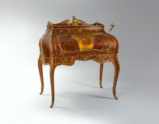 本次展品中有部分來自法國(guó)十九世紀(jì)末與二十世紀(jì)初最偉大的巴黎高級(jí)木匠弗朗索瓦?林克(Fran?ois Linke,,1855-1946) (以下簡(jiǎn)稱“林克”)。林克的作品因其超凡的品質(zhì)以及對(duì)路易十五融合新藝術(shù)主義風(fēng)格的富有創(chuàng)新性的獨(dú)特藝術(shù)風(fēng)格的演繹而備受贊譽(yù)。1906年他得到了法國(guó)最高榮譽(yù)十字勛章。 例如,展品中西班牙國(guó)王的寫字桌是19世紀(jì)法國(guó)罕見的弧形拉門寫字桌。這件弧形拉門淑女寫字桌是林克給西班牙國(guó)王制作的,路易十五風(fēng)格,細(xì)節(jié)精湛完美。林克制作櫥柜的精美技藝都包含在其中:精心打造的鎏金銅飾和薄板貼面工藝以及一系列櫥柜制作工藝。