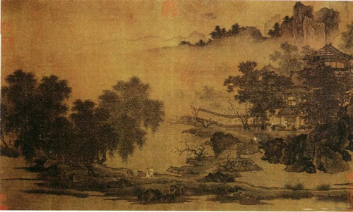 劉松年《四景山水圖》(春景),絹本設色,25.8×26.4cm,南宋,北京故宮博物院藏