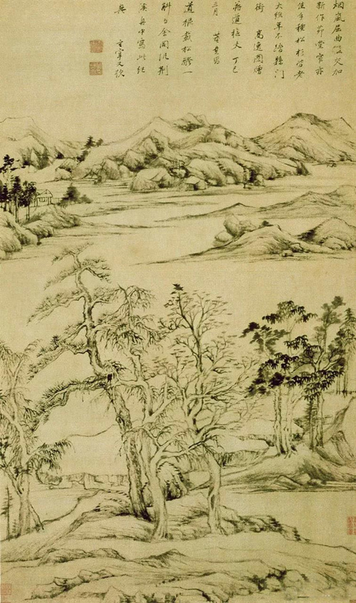 并非所有的春景圖都描繪春和景明、心曠神怡的景象。一幅畫作不僅是畫家所見景物的再現(xiàn),同時也反映作者當下的心境。《高逸圖》為董其昌晚年所做,該圖并未刻畫春日暖意;相反,通過描繪冷寂空闊的山林從而抒發(fā)畫家歷經(jīng)劫亂的悲涼心境。