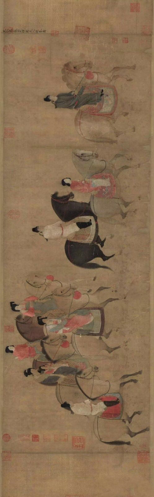 張萱《虢國夫人游春圖》,絹本設色,51.8×148cm,明代,遼寧省博物館藏。原作已佚,現(xiàn)存的是宋代摹本。