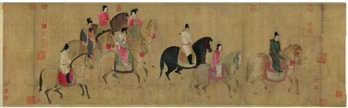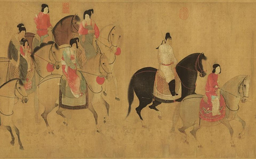 張萱的《虢國夫人春游圖》,就記錄了楊貴妃的三姊虢國夫人及其眷從騎馬春游的場景。