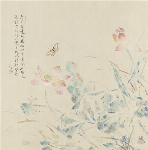 在她細(xì)心經(jīng)營(yíng)又率意自在的筆墨氛圍下,其花卉可謂“清如水碧,潔如霜露”,用筆清勁爽利,敷色幽新雅致,淡逸而不入輕浮,朦朧卻絕無(wú)羸弱,點(diǎn)綴了靈動(dòng)的草蟲(chóng),粉蝶,如夢(mèng)如詩(shī)如幻,令人幽思無(wú)限……