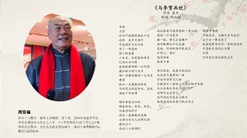 中央電視臺(tái)著名主持人楊柳、崔志剛先生發(fā)來了誦讀視頻,分別朗誦了洛夫先生的《眾荷喧嘩》和《雪地秋千》。著名音樂人、洛夫之子莫凡朗誦了自己創(chuàng)作的《念父親》。方明、章邁、梅子、寇博、韓長(zhǎng)福等眾多的朗誦者深情朗誦了洛夫的經(jīng)典詩篇,或有關(guān)紀(jì)念洛夫的作品(附后)。現(xiàn)場(chǎng)的觀眾們沉浸在朗誦者演繹出的洛夫詩歌生動(dòng)感人的藝術(shù)境界。詩歌與誦讀交相輝映,相得益彰,詩歌使誦讀韻味十足,回味無窮;誦讀讓詩歌穿越時(shí)光的河流,重現(xiàn)勃勃生機(jī)。而中央電視臺(tái)兩位著名主持人發(fā)來的朗誦視頻,其專業(yè)水準(zhǔn)的朗誦令人耳目一新,更把這場(chǎng)詩歌與誦讀的盛宴推向高潮。