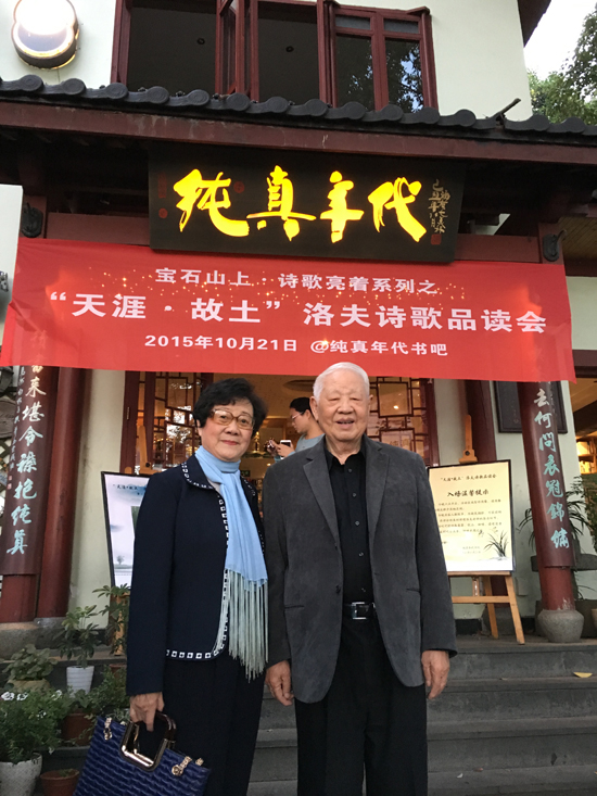 洛夫夫婦與《天涯美學》主編周岳平先生、“純真年代書吧”創(chuàng)始人朱錦繡合影