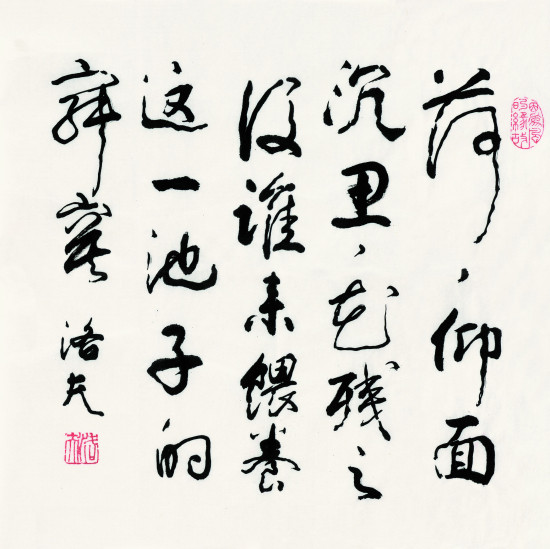 洛夫之書法美在意境。詩與書法在藝術家身上得以完美融合,他在寫“落花無言,人淡如菊”這件作品時,先以淡墨書寫下句的“人淡如菊”,待墨干后,再以濃墨就著寫成的字跡之上,重疊地書寫了上句“落花無言”,造成畫面上一種縱深的幻象立體效果。