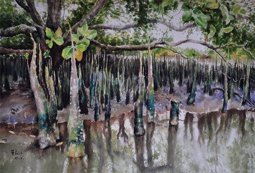 藝術(shù)創(chuàng)作源于生活,藝術(shù)家在生活中的任何遭遇,都可能成為他藝術(shù)創(chuàng)作的靈感來源。每一位藝術(shù)家的藝術(shù)表現(xiàn)都無一例外的受到他所在的環(huán)境所影響和制約。啟江常年生活在海南島,因此他的水彩風(fēng)景畫也就是從海南的自然景觀中得到感悟,必然要表達(dá)的也是海南的大自然;海南島是一個熱帶海洋氣候的大島,在這里最美的是熱帶雨林,最多的也是熱帶雨林,熱帶雨林中最突出的色調(diào)就是濃濃的綠色。因此,綠色也就成為他無法繞過的一道問題。對于綠色的特點(diǎn)他心里十分清楚,但是,明知艱難還要為之,就他的這份勇氣,我也要敬佩三分。黃啟江的創(chuàng)作道路,一直都在奉行著現(xiàn)實(shí)主義,在各種流派、各種主義橫行畫壇的日子里,他從來都沒有動搖國自己的信念。他最早給我看的作品是表現(xiàn)海南的紅樹林,后來給我看到的還是不同角度表現(xiàn)的紅樹林。在色彩運(yùn)用上,他大膽的運(yùn)用了很多非常飽和的綠色,可見他對紅樹林已經(jīng)十分癡迷,究竟是是什么原因讓他對紅樹林如此的癡迷和執(zhí)著,投入那么多時間來研究。我想,這也許跟它的身世是分不開的,紅樹林是生長在海邊的喬木雖然常年生活在水中,但是紅樹林卻是最缺水的植物。在大海的眼里,紅樹林是陸地植物,但是在大山坡面前,它的故鄉(xiāng)又屬于大海。紅樹林生長周期非常長,由于需要抵抗?jié)q潮時候海浪的沖擊,它的樹頭上長著很多根系,將自己牢牢地固定在灘涂上面。也許是身份太過于相似,黃啟江對紅樹林一直都保持著非常飽滿的熱情。