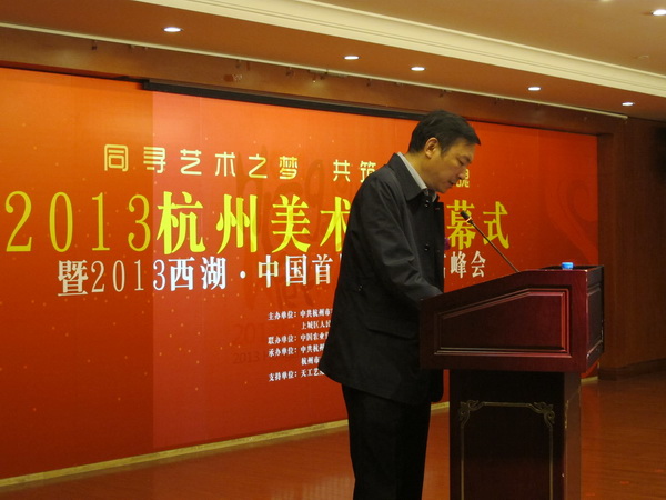 10月31日,在天工藝苑,“2013杭州美術(shù)節(jié)”暨西湖·中國首屆藝術(shù)財富峰會及“藝術(shù)財富”中國名家書畫作品展隆重召開。浙江省文化廳巡視員、省書協(xié)主席鮑賢倫,杭州市人大常委會副主任陳振濂,杭州市人民政府副市長陳紅英,中國美術(shù)學(xué)院黨委書記錢曉芳,杭州市委宣傳部常務(wù)副部長、市文創(chuàng)辦主任魏皓奔,上城區(qū)區(qū)委書記繆承潮,上城區(qū)人民政府代區(qū)長陳瑾,中國國家畫院院委、杭州市美協(xié)主席吳山明,臺灣中華畫院院長李奇茂,中國美術(shù)學(xué)院副院長王贊等省市區(qū)領(lǐng)導(dǎo)及藝術(shù)家代表出席了開幕式。開幕式由中共上城區(qū)區(qū)委常委、宣傳部長麻承榮主持。