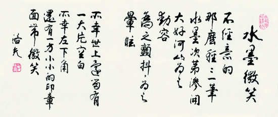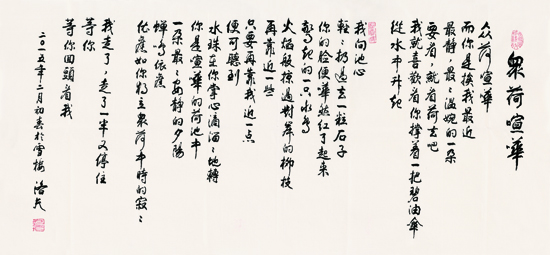 洛夫之書法具有鮮明的文化意識,富含中華文明的學(xué)養(yǎng)。他的書法頗具高雅的氣質(zhì)和風(fēng)度,是這樣一種內(nèi)外一致的氣韻優(yōu)雅、動靜結(jié)合的靈動,這又是與博學(xué)、謙遜、高雅、悲憫情懷等人類美德密不可分,這是洛夫之書法所特有的優(yōu)雅書卷和文人氣息。他的書法字里行間集中體現(xiàn)了中庸、內(nèi)儉、含蓄等中華文化的審美精髓。他遠(yuǎn)離地緣政治,寧靜于禪、道的虛空,清新華澤,純凈質(zhì)樸,一股淡雅之氣與超純自然清新之風(fēng),乃是中國文人知識分子的本真,高風(fēng)清骨,以及對事對物不帶偏見、不帶色彩的清澈認(rèn)知,所煥發(fā)出來的清雅純粹藝術(shù)成就。