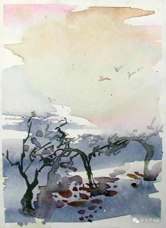 《蕭瑟秋意》---輕寒蕭瑟的夕陽下,一簇簇零落寂寞的枯枝,一片片清瘦飄散的落葉,一群群相伴遠行的飛鳥,以淺淡水痕抒寫著蕭瑟的秋姿,以明凈妝容映襯著寂寥的秋意。