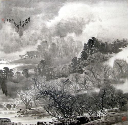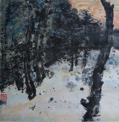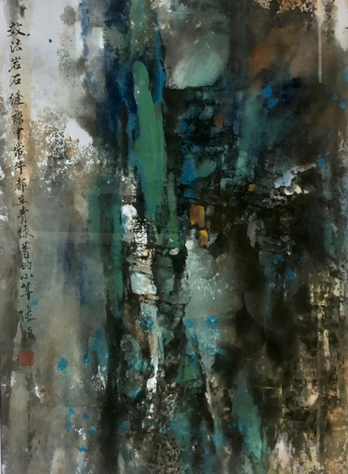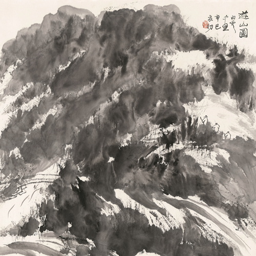 七位畫家之中最早獻身藝術創(chuàng)作的劉知白 (1915-2003) 創(chuàng)造了新的潑墨語言,在世紀之交,成為了中國畫傳統(tǒng)的最后守望者和新世紀創(chuàng)新的前行者。先生一生襟懷坦蕩,意存高古,生逢亂世,卻遠離政治及主流畫壇的干擾,始終堅守著文化人的自由品格和良知,恰如孤峰頂?shù)膬敉?、塵世中的清流。以 “藝界仁者”尊之,實為允當之評。他晚年的水墨創(chuàng)作,筆墨均極其精到,而墨韻尤更可觀。他的大寫意山水,近觀若似無象,遠觀則山川縱橫、結構嚴謹,令觀者情緒時而沉靜、時而奔放,可謂絕妙!