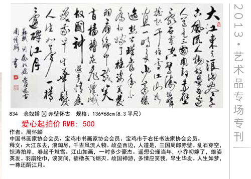 新華收藏網(wǎng)-藝術(shù)家頻道簽約畫家作品亮相“藝術(shù)珍品,愛(ài)心綻放” 中國(guó)少年兒童文化藝術(shù)基金會(huì)先心病救助專項(xiàng)基金2013年第二期公益拍賣會(huì),拍賣時(shí)間3月30日,感謝藝術(shù)家王強(qiáng),董亞涵,唐宏君,高源,周懷麟,無(wú)私奉獻(xiàn)的藝術(shù)藝術(shù)精神,大愛(ài)無(wú)疆!