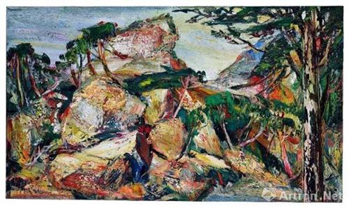 在2013年的作品《石崖》中,尹朝陽(yáng)狂放不羈的筆觸堆棧出斑斕的繪畫(huà)肌理,稠厚的顏料在畫(huà)布上層層刮擦、涂抹,形成了一種奇絕的“筆墨”感覺(jué)。色彩運(yùn)用上遵循了塞尚的色彩法則─用色彩表達(dá)空間和結(jié)構(gòu)。畫(huà)中山石堆砌呈三角形構(gòu)圖,這一穩(wěn)重敦實(shí)的感覺(jué)便是通過(guò)高純度、大面積、冷暖對(duì)比強(qiáng)烈的色塊來(lái)完成,制造出粗礪、凜冽、炫麗的視覺(jué)趣味。山石粗糙冷峻,棱角分明,寂然不動(dòng),這一典型的北方地貌隱含著凝重、蒼涼、奇炫、膠著的心理特質(zhì)。呈現(xiàn)出浪漫主義的悲壯、象征主義的神秘、表現(xiàn)主義的自我宣泄。