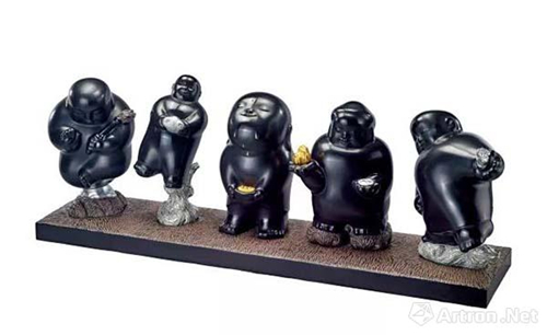 《經(jīng)典套組作品:雪峰仙蹤、乘云氣、黃金雨、天界山水、煙云供養(yǎng)》由五件2000-2007年間之創(chuàng)作組成。李真的雕塑雖是墨黑色為主而體型飽滿(mǎn),卻以動(dòng)作和姿態(tài)的平衡而給人浮游于空中之輕盈感,是質(zhì)感與力量完美結(jié)合之體現(xiàn)。李真作品中的人物形象身軀圓融、質(zhì)感光滑,曲線(xiàn)簡(jiǎn)約流暢,具有佛像的安詳面容而又略帶孩童般的稚氣。雕塑雖是墨黑色為主而體型飽滿(mǎn),卻以動(dòng)作和姿態(tài)的平衡而給人浮游于空中之輕盈感,是質(zhì)感與力量完美結(jié)合之體現(xiàn)。