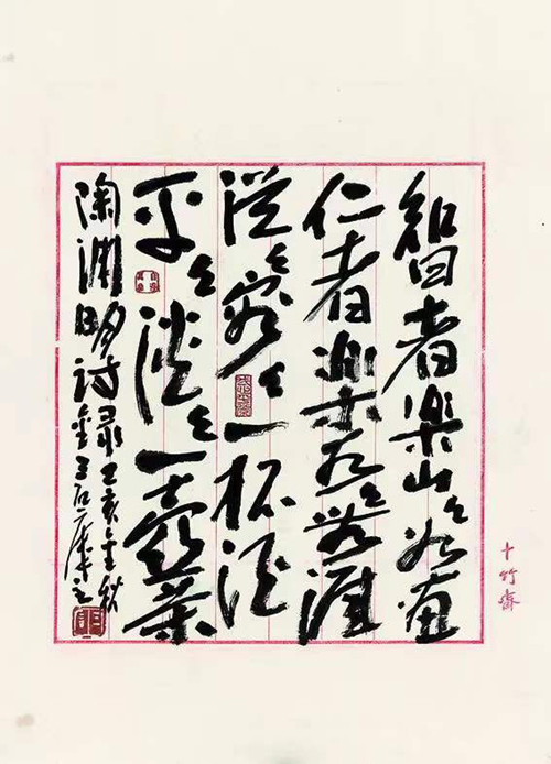 觀賞曾宓先生的書法作品,不由想起杜甫曾作的詩句“由來意氣合,直取性情真”,先生的書作真實(shí)地透露著他的秉性氣質(zhì)與情感思想,傳達(dá)出他的學(xué)問、修養(yǎng)、心境、才思、志趣,為觀者帶來精神的愉悅:《智者樂山,仁者樂水》作品放置在月白色的十竹齋信札中,以山水意境詩句“智者樂山山如畫,仁者樂水水無涯”入書,“從從容容一杯酒”中蘊(yùn)藏著“我心平?!保捌狡降粔夭琛眳s能“自得其樂”,字里行間折射出淡泊寧靜,“三石”樓主正與陶淵明遙相對望,書者悠閑澹然的性情躍然紙上;