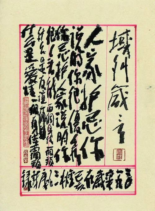 在禪黃色的紙張上,用微醺的醉墨書寫著調(diào)侃的自編詩句“殘山剩水出刁民,家學(xué)淵源出傻子”,微妙的濃淡層次感中灌注著人生哲理,這是經(jīng)歷風(fēng)雨打磨后的感悟所得。