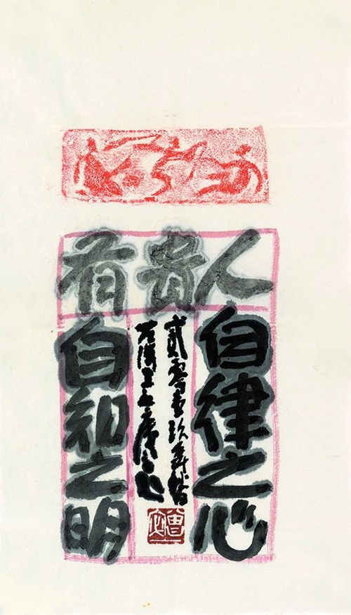 在拓片書法作品中,墨韻的濃淡清淺把控得完美無瑕,當(dāng)手舞足蹈飄飄然的時(shí)候,曾先生用自撰的語句“人貴有自律之心,自知之明”提醒自己與世人,禪心與智慧鑄成為無聲詩。