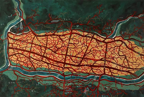 展覽期間,在展廳中有一堆我從拆遷的建筑垃圾上撿來的瓷片,一張生我養(yǎng)我血脈相連的豐陽城地圖,我想用非常微觀的個人視覺來敘述我眼中的城市,我的眷戀,憂傷和無可奈何的疏離感,還有那日漸模糊的回家之路,無論我身在哪里,故鄉(xiāng)的一切早已滲進我的血液。這批作品除了鄉(xiāng)愁還有批判!