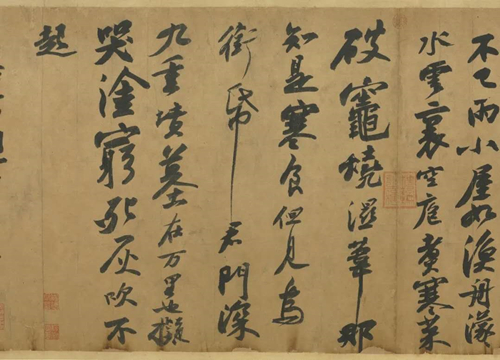 蘇軾被貶黃州時(shí)于1085年為報(bào)答好友孫覺(jué)(北宋文學(xué)家、黃庭堅(jiān)的岳父)的款待之恩,畫(huà)了這幅《瀟湘竹石圖》送給孫覺(jué)。該作采用長(zhǎng)卷式構(gòu)圖,展現(xiàn)了湖南省零陵縣西瀟、湘二水合流處遙接洞庭的蒼茫景色。整幅畫(huà)作以瀟湘二水的交匯點(diǎn)為中心,遠(yuǎn)山煙水,風(fēng)雨瘦竹,近水與云水、蹲石與遠(yuǎn)山、筱竹與煙樹(shù)產(chǎn)生強(qiáng)烈對(duì)比,畫(huà)面極富層次感,讓人在窄窄畫(huà)幅內(nèi)如閱千里江山。